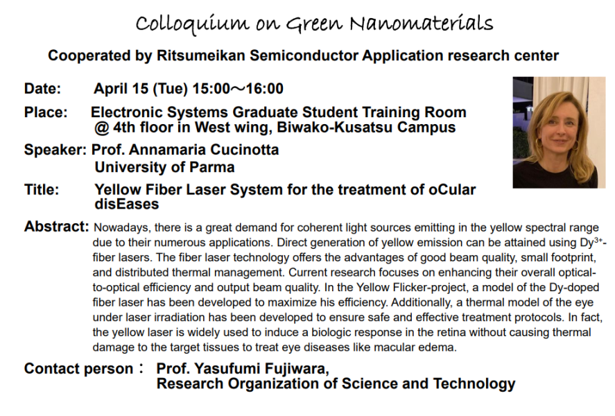 Prof. Annamaria Cucinotta will deliver a lecture on Yellow Fiber Laser Systems for ocular disease treatment on April 15 (Tuesday) from 15:00 to 16:00 at the Electronic Systems Graduate Student Training Room, 4th floor, West Wing, Biwako-Kusatsu Campus. File.pdf ...
