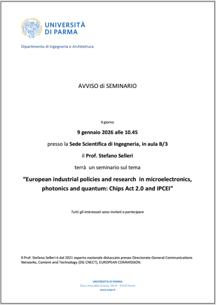 On 9 January 2026 at 10:45 a.m., Prof. Stefano Selleri will give a seminar on European industrial policies and research in microelectronics, photonics, and quantum technologies, focusing on Chips Act 2.0 and IPCEI. The event will take place at the Scientific Campus of Engineering, Room B/3, and is open to all interested participants. pdf ...
